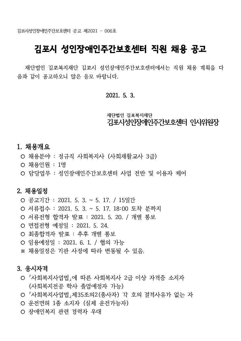 김포시종합사회복지관 2021년도 제1회 정규직 직원 채용 공고