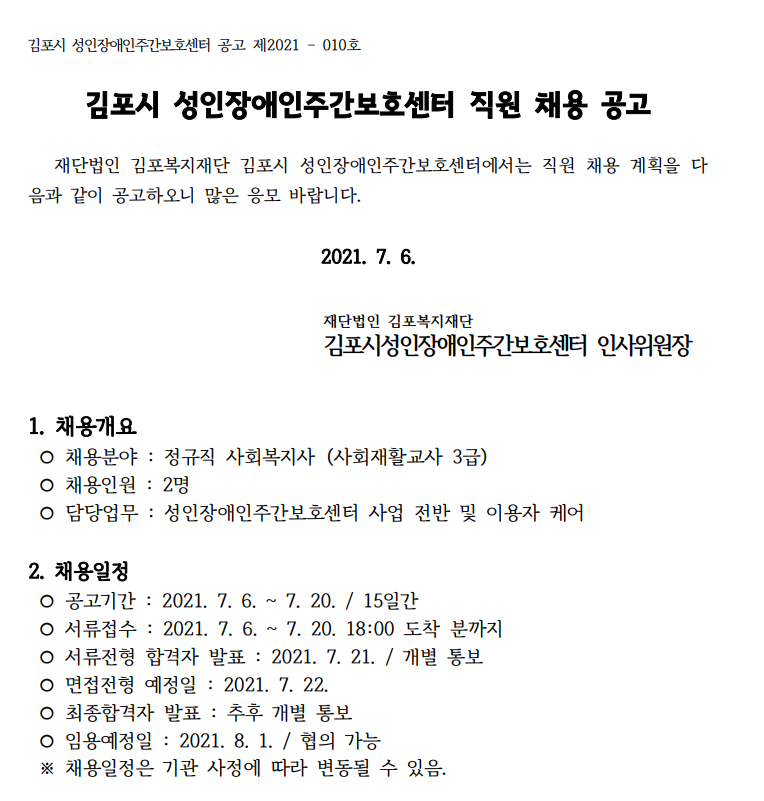 김포시성인장애인주간보호센터 2021년 제3차 직원(정규직 사회복지사) 채용 공고