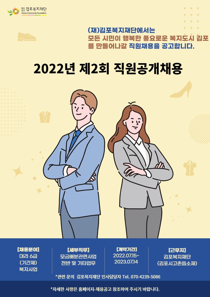 (재)김포복지재단과 함께 모든 시민이 행복한 풍요로운 복지도시 김포를 만들어 나갈 직원채용계획을 다음과 같이 재공고하오니 많은 지원바랍니다.