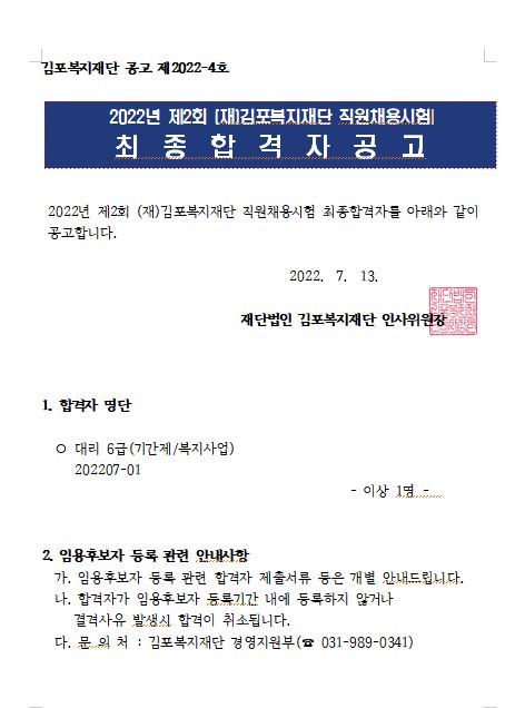 2022년 제 2회 (재)김포복지재단 직원 채용 시험 최종합격자를 아래와 같이 공고합니다.